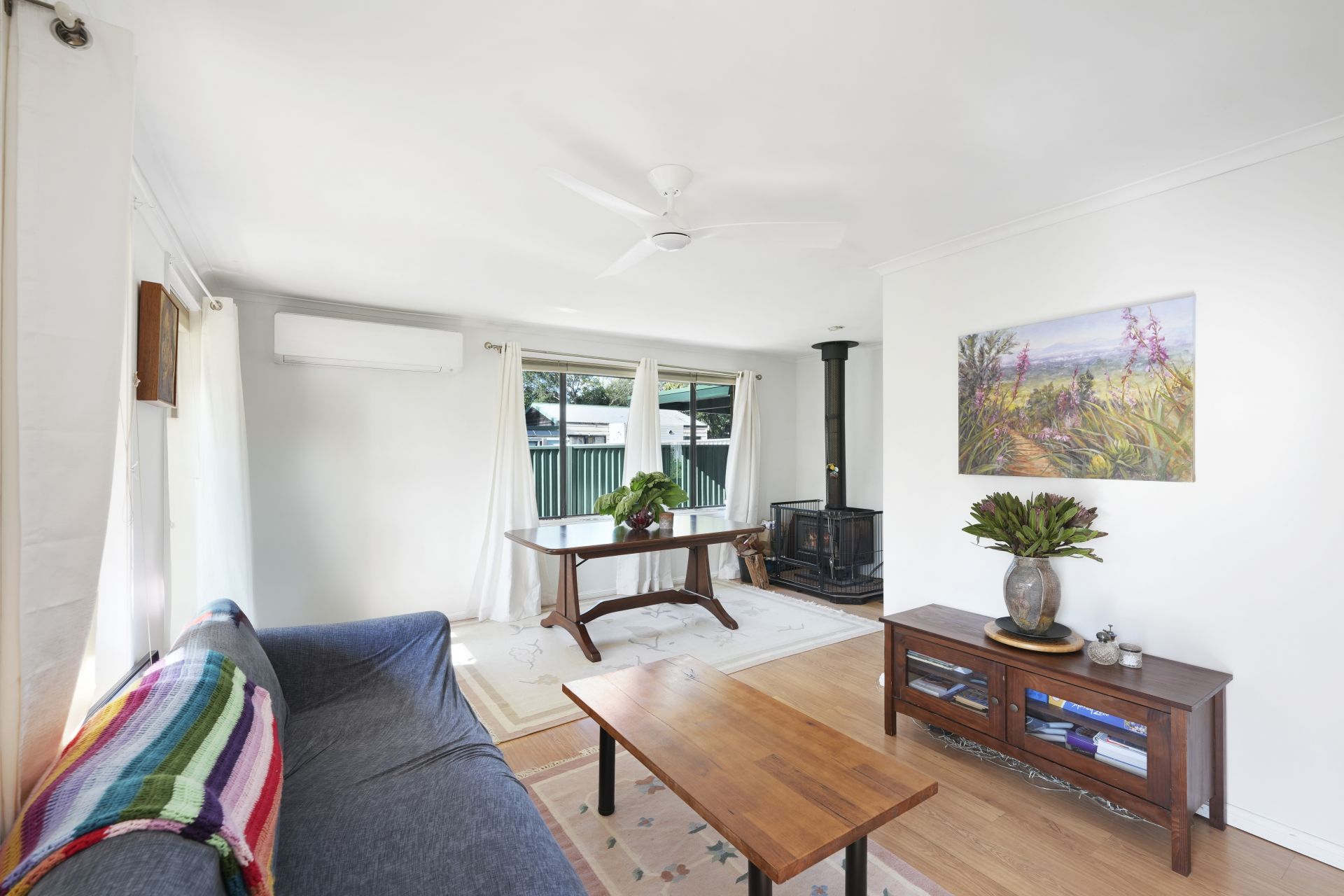 - slow-combustion fire place with reverse cycle air conditioner and ceiling fans