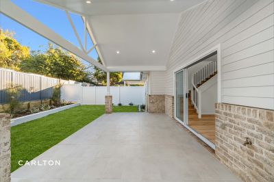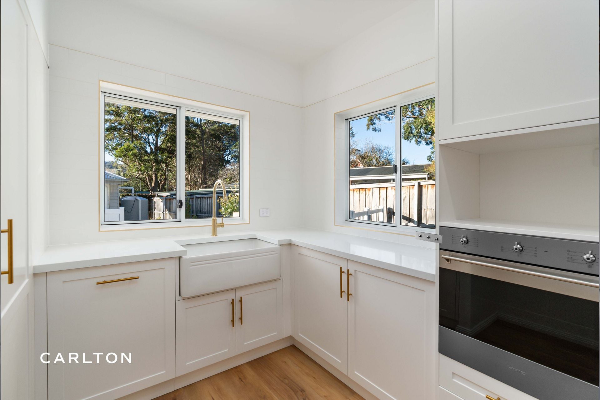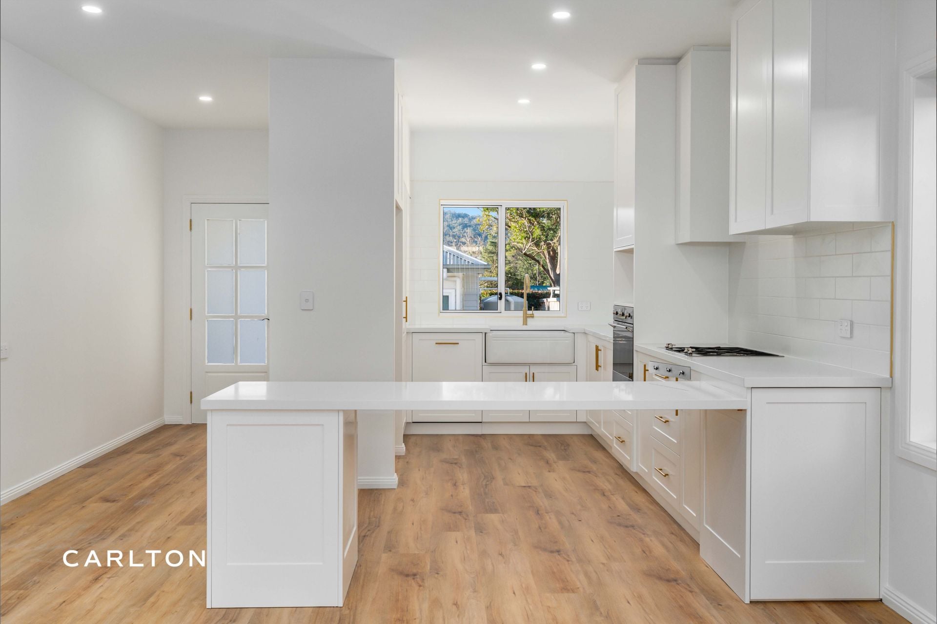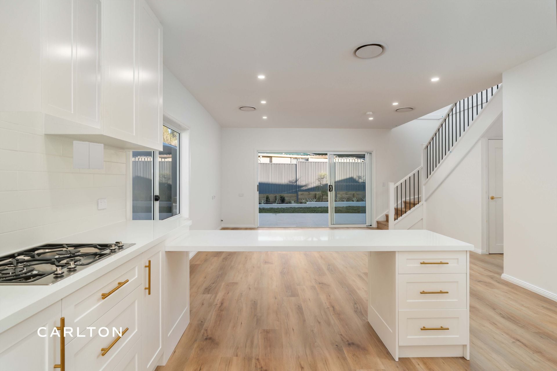 The gourmet kitchen is a true centrepiece, complete with 40mm stone benchtops, shaker-style cabinetry, and European-style laundry, all finished in a calming Hamptons-inspired palette.