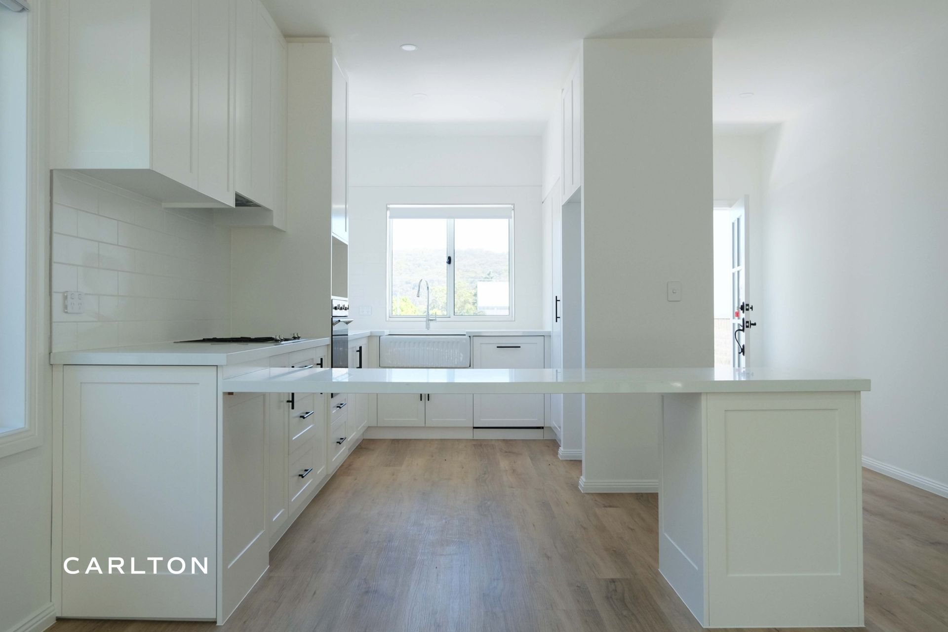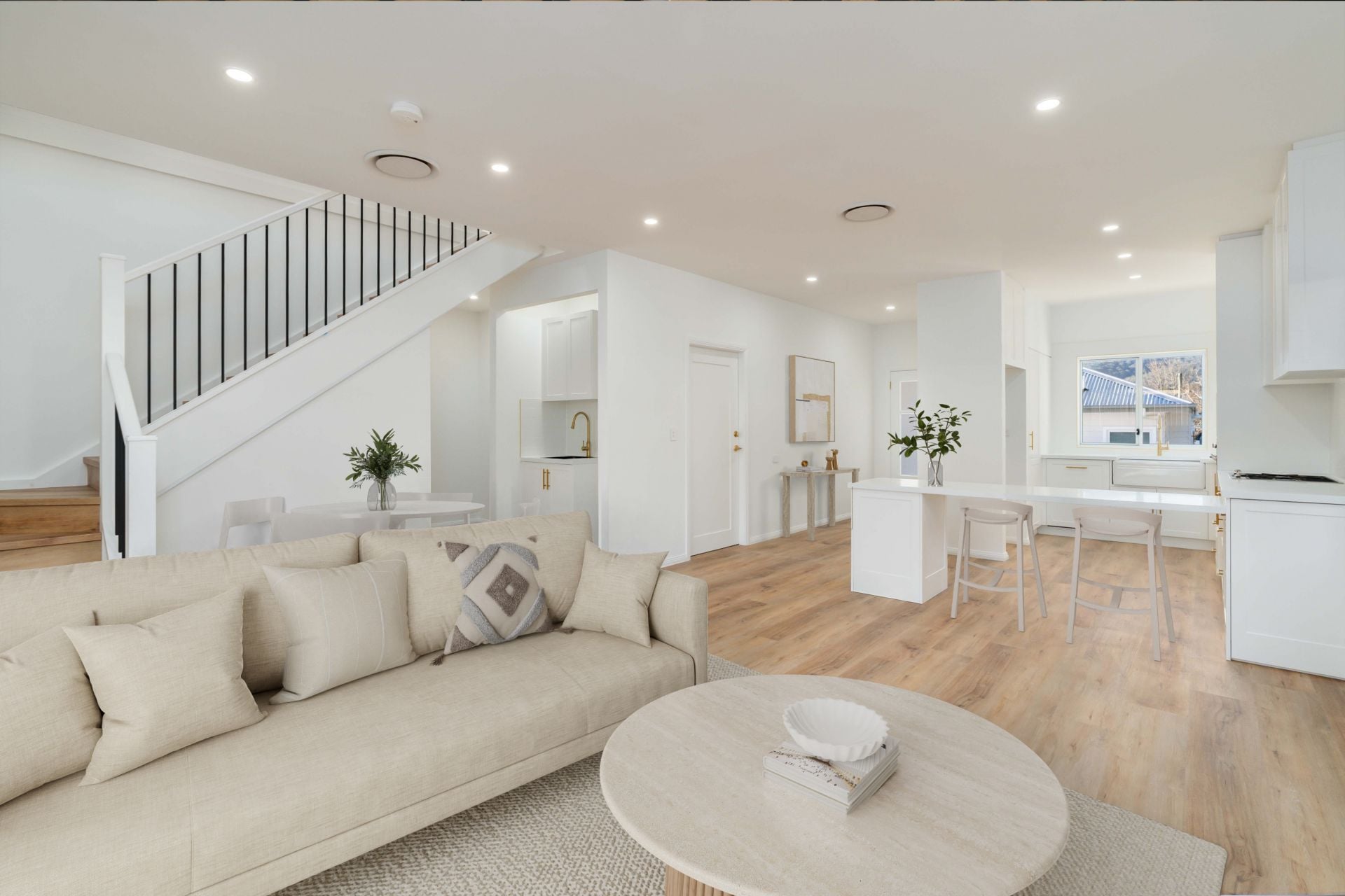The gourmet kitchen is a true centrepiece, complete with 40mm stone benchtops, shaker-style cabinetry, and European-style laundry, all finished in a calming Hamptons-inspired palette.