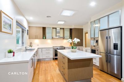 The expansive footprint of this home features five bedrooms plus a dedicated office, four separate living zones and a gourmet kitchen complete with built-in fridge and Italian marble preparation area. High raked ceilings, spotted gum flooring and European lighting enhance the refined interiors, while commercial-grade finishes and a steel-framed roof highlight the home's quality build.