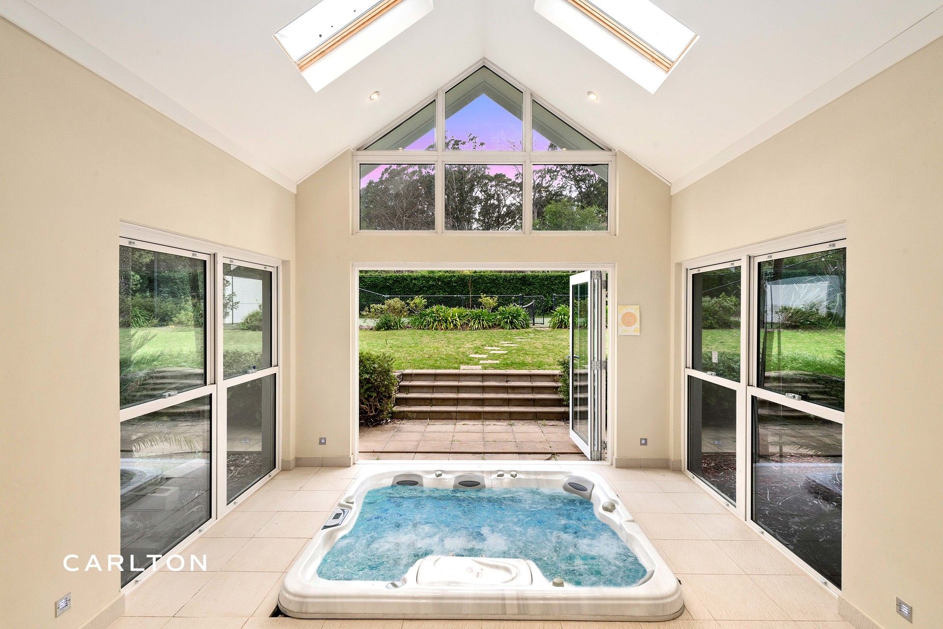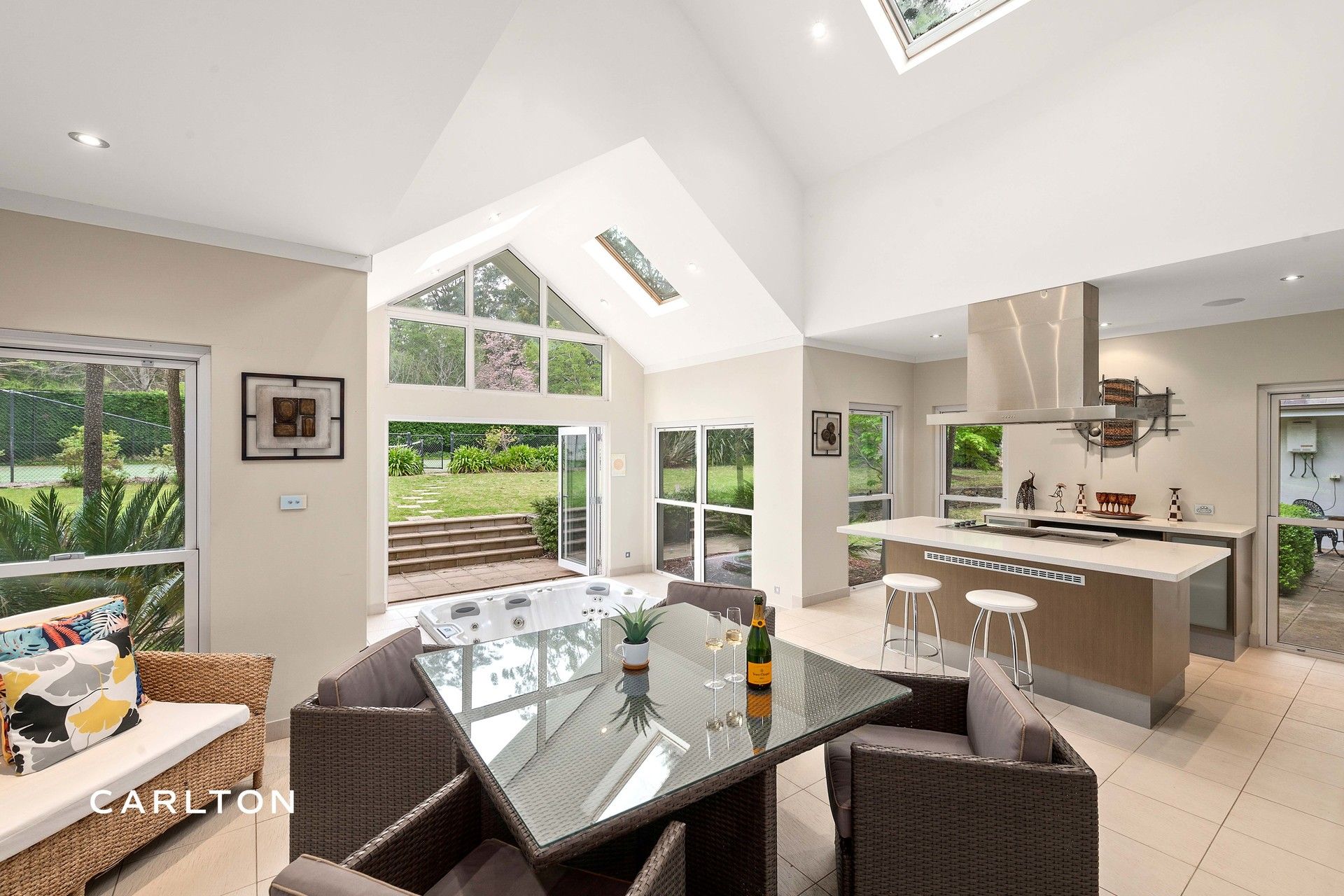 An all-season alfresco area extends under the main roofline, offering heated floors, a teppanyaki grill, spa and views across manicured grounds and a full-sized tennis court.